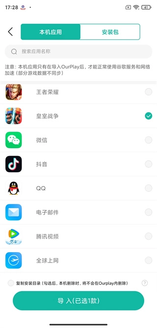 3、然后点击导入应用/游戏;在此界面找到皇室战争,勾选之后点击导入;