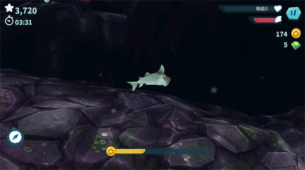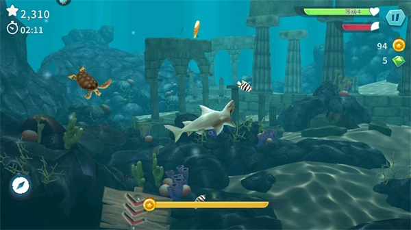 4、完成五十个任务,寻觅宝物以获取金币与宝石,这些可用于升级你的鲨鱼,或者购买特殊的救生道具。