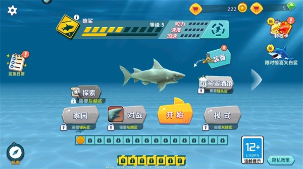 礁鲨达到满级后会进化为灰鲸鲨,就像我目前所拥有的这样。此时血槽变长了,还能够前往更深一些的水域。不过依旧是吃吃吃的玩法攻略。当金币足够时,要尽快提升咬合力和加速度,只有将这些属性都加满,才能进化到下一个鲨鱼品种。每日登录的地方一定要去领取奖励,现在是金币和绿钻交替发放,这两者都具有解锁鲨鱼品种以及技能装备的作用。