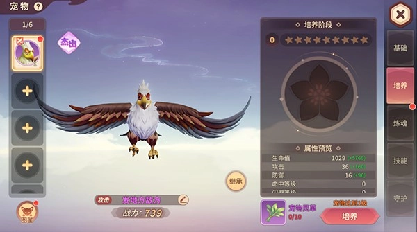 通过培养可以提升宠物的星级,增强宠物的各项基本属性,宠物星级越高,属性增幅就越大。在宠物培养中,需要消耗宠物灵草提升培养阶段,当养成满花状态后,消耗宠物神谷进行突破,即可升星。