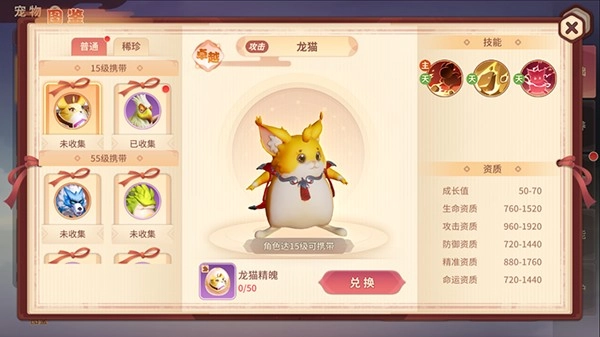 宠物有等级,星级,资质,技能四个养成维度。