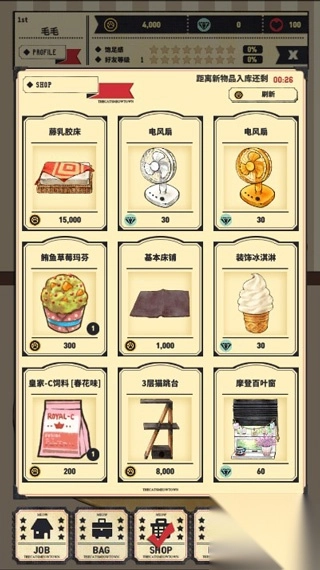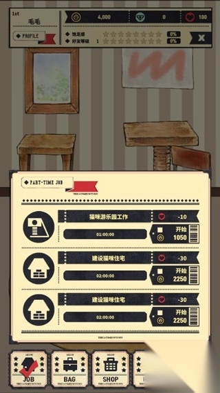 购买食物或家具只能用金币。快去打工赚金币。一旦开始打工,过段时间就会自动完成。要是能获得猫咪的爱心,就能打更多工啦。