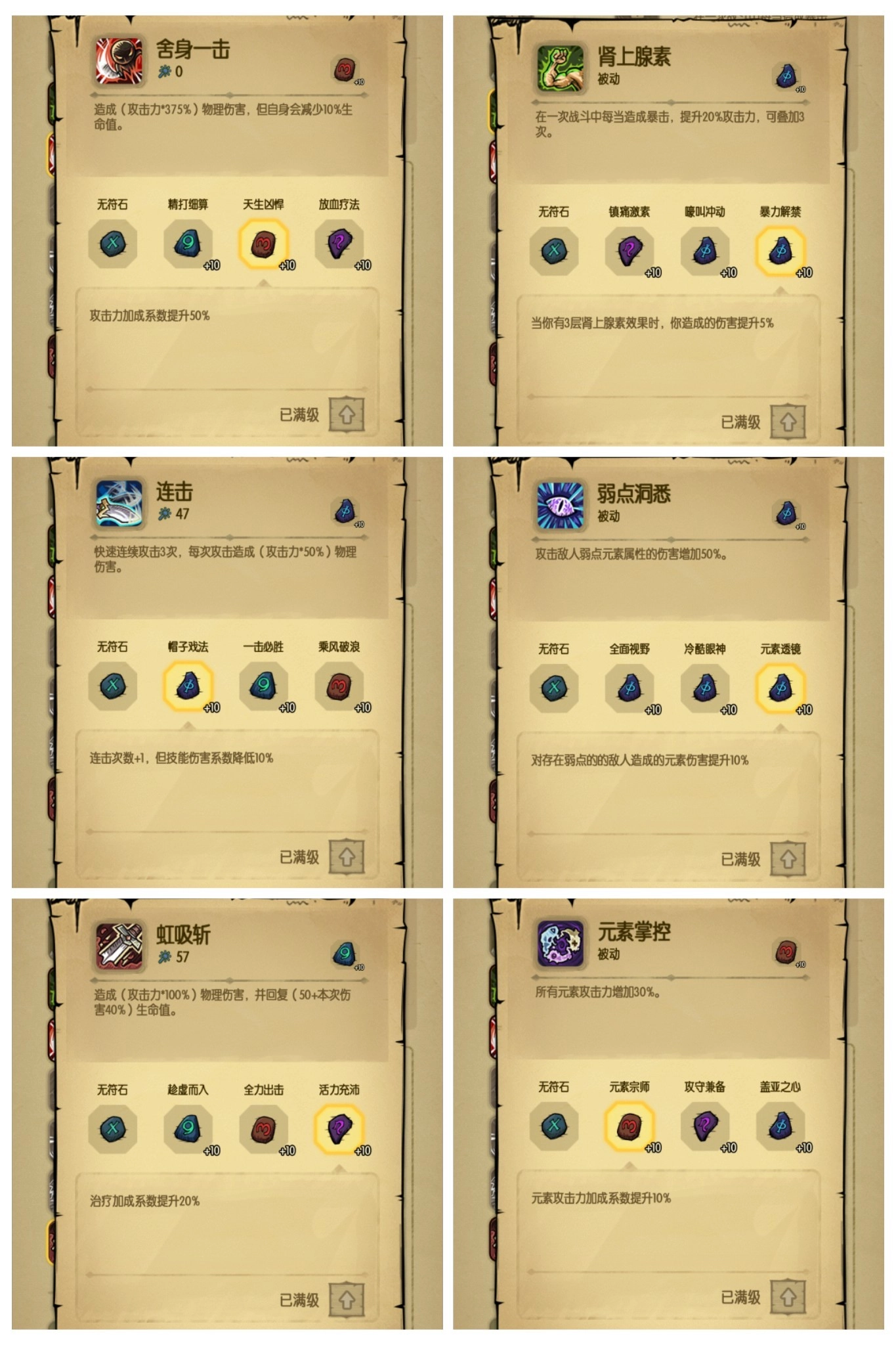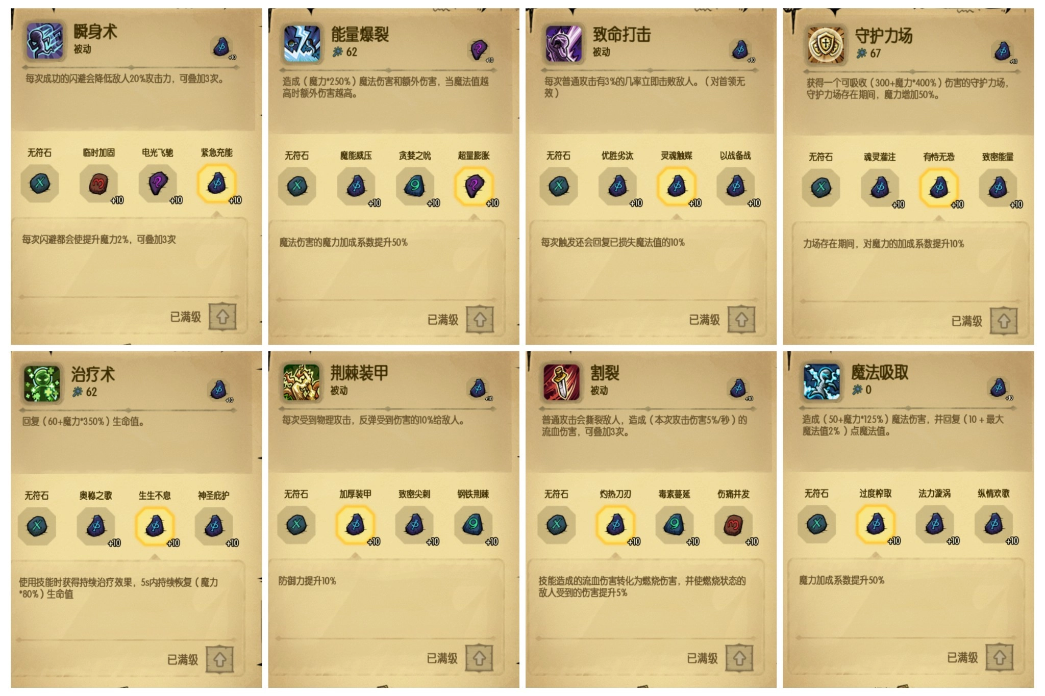 1. 火星、魔力增幅、冰弹、极寒冰弹、魔法盾、神之庇护、灾祸、回生祭品、水元素、剑盾三连斩、强化体质。