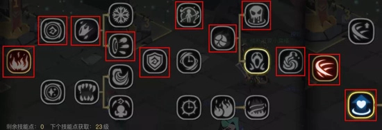 1. 火星、魔力增幅、冰弹、极寒冰弹、魔法盾、神之庇护、灾祸、回生祭品、水元素、剑盾三连斩、强化体质。