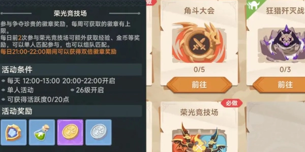 4、荣光竞技场为跨服PVP玩法,开启时间为每日12 - 13点以及20 - 22点。在此期间参与活动,可获得双倍徽章奖励,建议大家在该时间段参与。徽章能够用来兑换道具。