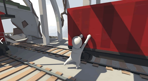 Bob突然从天而降,落在了火车关卡处。随后,他按下抓取键操控Bob,把黄色的垃圾箱挪开,接着走进了后方的那扇门。