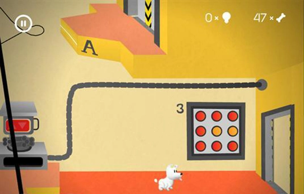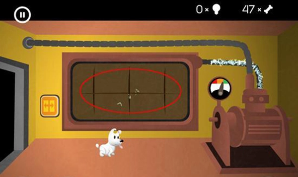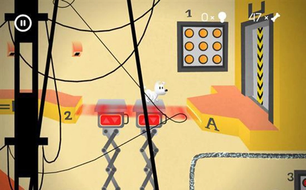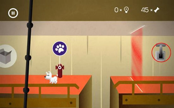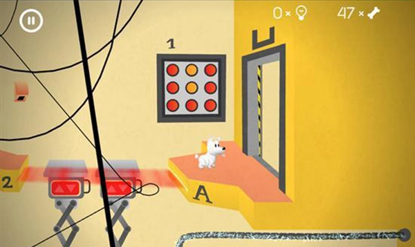 5、进入下一个场景的房间后,让mimpi狗狗跳上如上图所示的弹簧台阶。只需触屏点击一下这个弹簧,狗狗就能在上面移动。此时,玩家要操控狗狗向左边,也就是有骨头的方向移动。