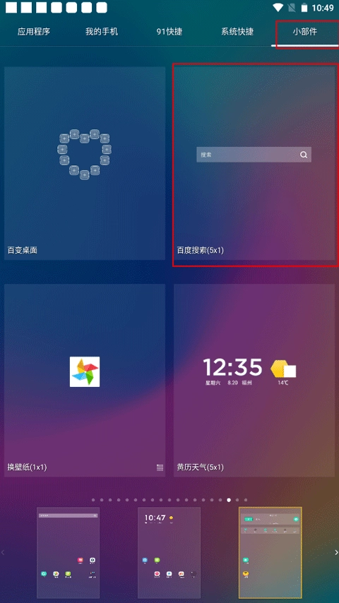 3、除了能够添加图标,还能添加小部件。操作方法为:选中想要添加的小部件,然后点击要添加到的屏幕主界面即可。