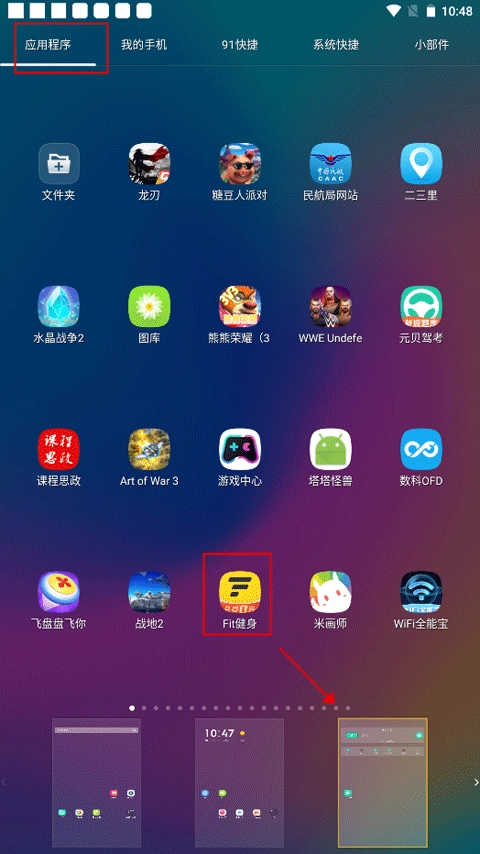 2、你能够添加应用程序图标、我的手机、91快捷等内容,只需选中图标并移动到对应的屏幕上即可。