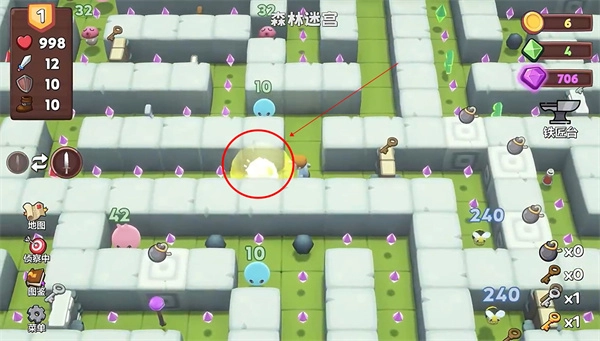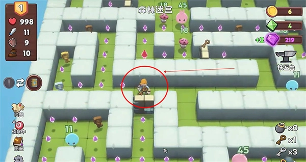 3、举个例子,若选择了森林,便能够进入森林迷宫。玩家所扮演的勇者需要在行进过程中一路收集宝石或者道具。
