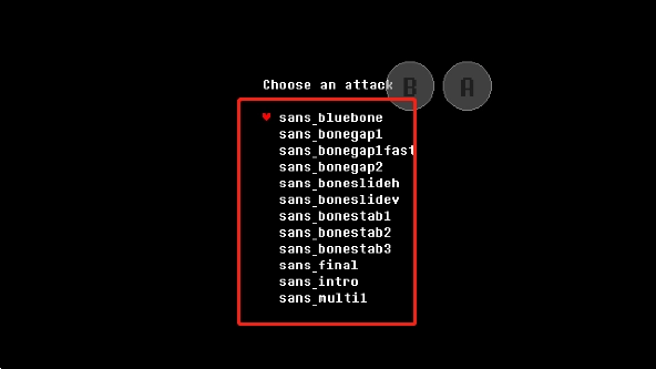 以下画面呈现的均是在“sans_bluebone”地图中的情况,接触蓝色骨刺能够恢复血量,而碰到白色骨刺则会损失血量。