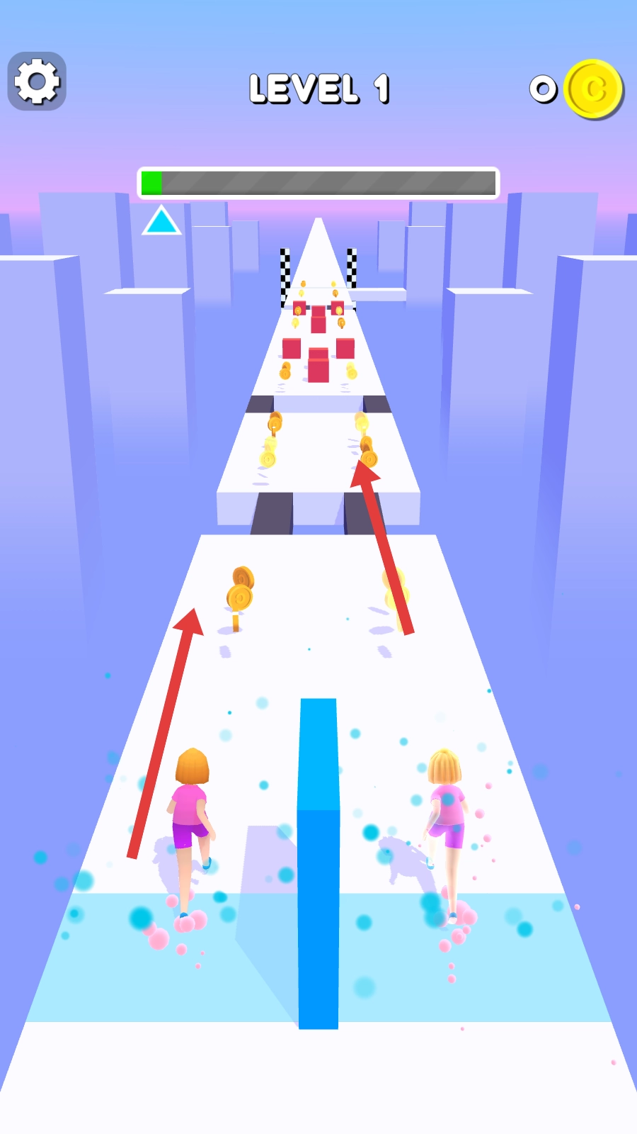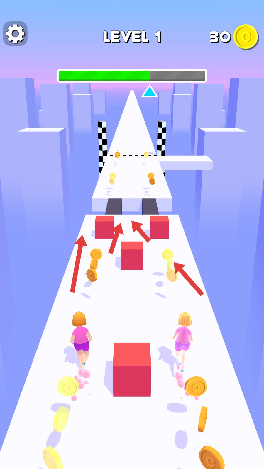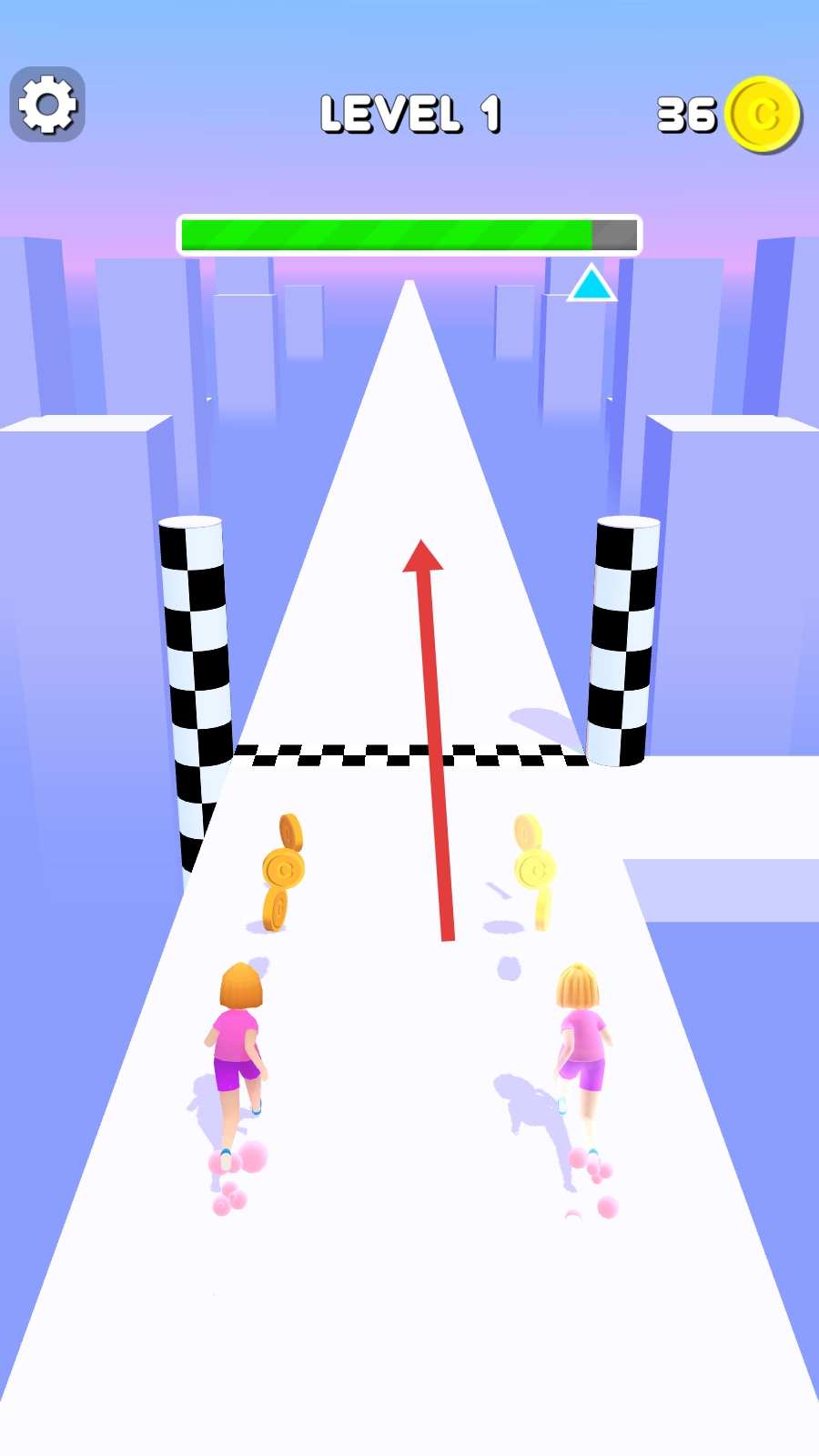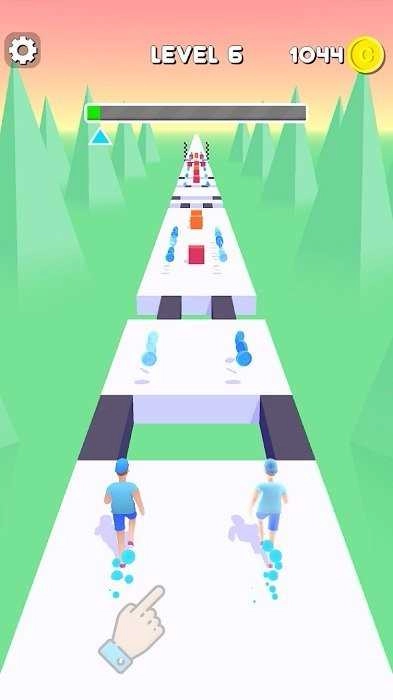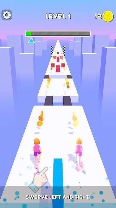 1. 开启游戏后,对两个角色进行操控,使其在赛道上奔跑。赛道上分布着金币,需尽可能多地收集这些金币。与此同时,能够看到关卡的进展情况以及已经收集到的金币数量。