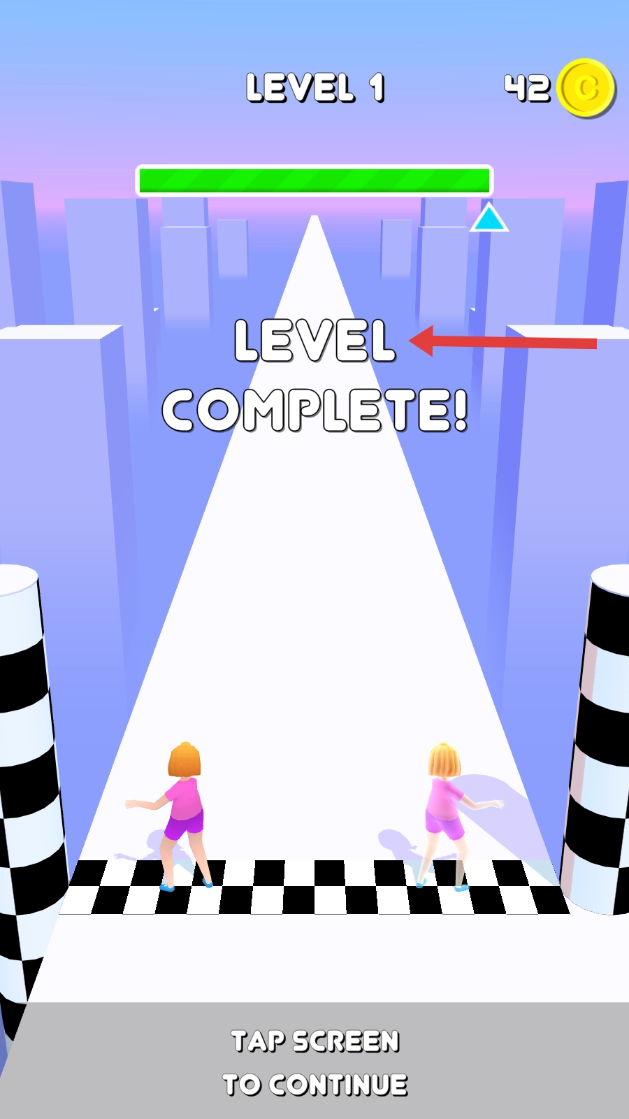 4、待两个角色均抵达终点,界面将呈现通过关卡的提示。这时,玩家点击屏幕,就能继续挑战下一关,开启新一轮的赛跑。