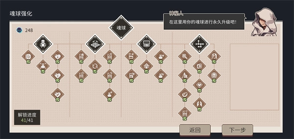 击杀敌人后会获取道具魂球,魂球能够用来购买秘宝、道具,甚至还能提升一些基础属性。鉴于基础属性不会因角色死亡而被清零,所以新手优先积攒魂球来提升等级。推荐的加点顺序如下:初始金币、卡牌商店必定出现打折商品、神秘商店必定出现打折秘宝、在上次角色挂掉的章节可获得少量遗产、提升血量、增加重置战斗的机会、放弃战斗结束时会有卡牌金币补偿以及其他项目。