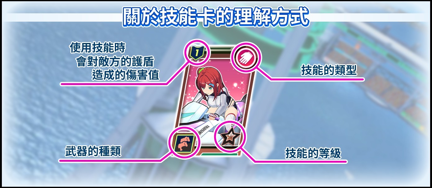 技能卡上会展示对敌人护盾造成的伤害、武器类型、技能类型以及技能等级。
