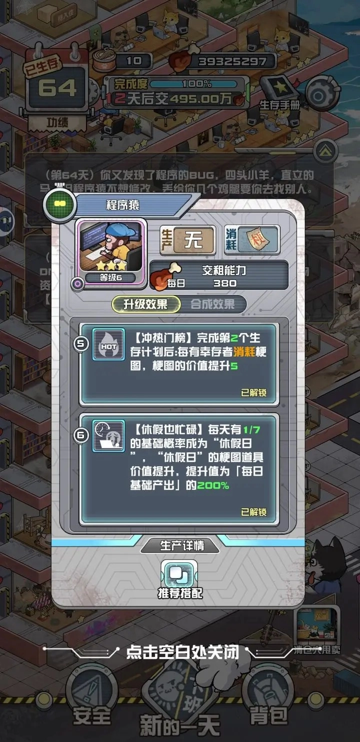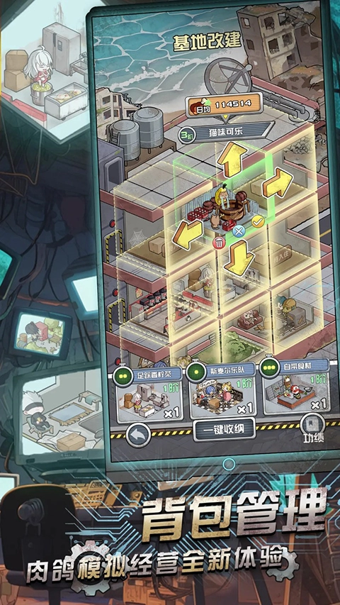 每位幸存者都具备独特的性格与技能。你需要凭借合理的搭配与规划,在有限空间内将他们安置于恰当的房间,借助他们之间的羁绊效应,提升生产与战斗效率。这里还有丰富、抽象且充满无厘头趣味的剧情等待玩家解锁体验。游戏融合了背包整理、Roguelike元素以及模拟经营玩法,为玩家带来前所未有的末日生存体验。