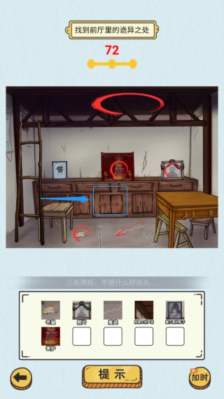 4、进入第三个场景,首先点击图中红圈圈出的部分:照片,老鼠,蛇皮,屋檐,点击房间的镜子就会出现镜子中的身影