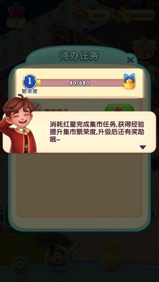 3、挑战成功后,点击“任务”,你会在此处看到待办任务,完成任务就能获取经验。另外,收集红星后,可消耗红星完成集市任务,不仅能获取经验,还能提升集市繁荣度。集市升级后,还有丰厚奖励等着你哦~