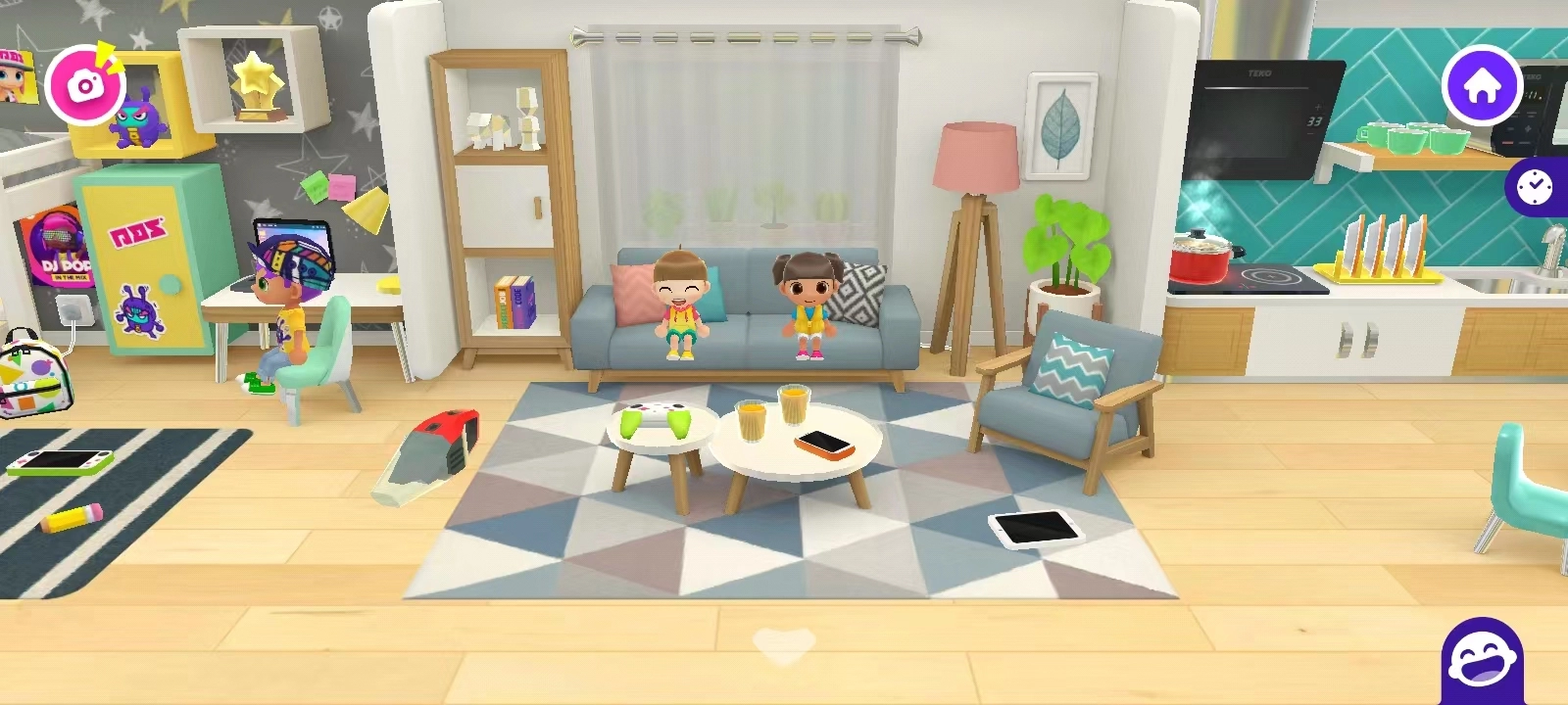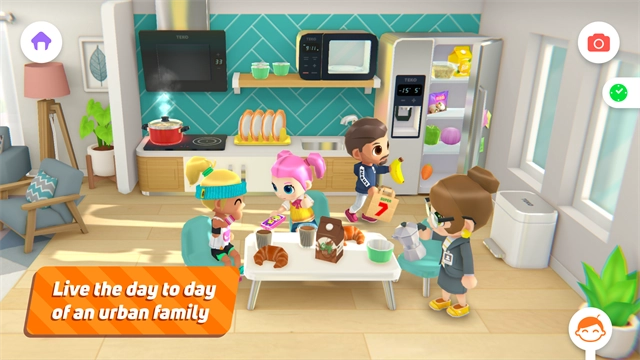 5、点击身后的大门,即可切换至另一个场景。进入新场景后,呈现的是家居生活场景。在此场景中,你能够点击卡通人物,让其进行玩耍、做饭等活动,同时还能左右滑动屏幕。若想回到之前的场景,点击下方透明白色按钮即可。