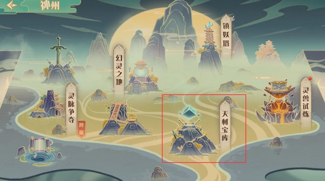 当【符石】功能开启时,主界面上方的【神州】副本界面中,【天材宝库】副本入口也会随之同步开启。
