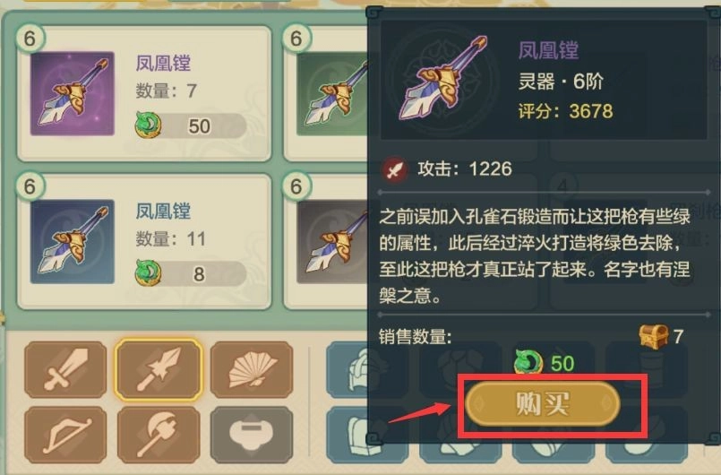 你可以在下方挑选想购买的装备类型,随后在上方点击购买心仪的装备。上方会分别展示装备的等级、名称、数量、品质以及价格。