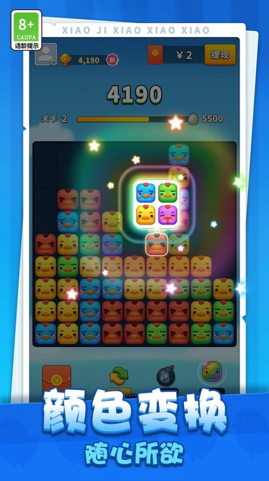 小鸡消消消是一款休闲益智类游戏,在游戏当中玩家能够体验经典的三消玩法,只需要将颜色形状相同的小鸡连接在一起就能够进行消除。玩法非常的多样,有多种关卡供玩家挑战,能够让玩家感受到消除带来的乐趣,喜欢的玩家可以体验。