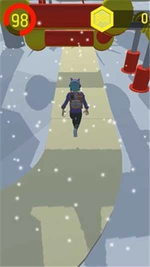 2、行进中收集赛道上的道具,利用能量补充或武器道具应对复杂障碍,保持角色奔跑状态。