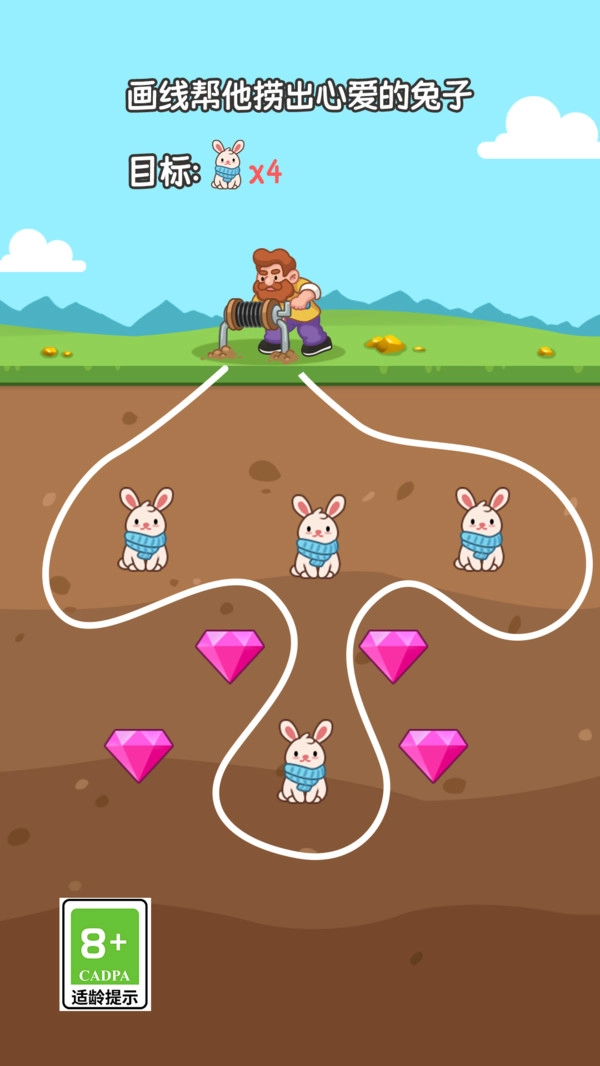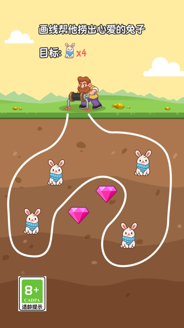 在屏幕上,用手指绘制出一条连贯不断的线条,此线条即为挖矿的轨迹。线条经过的地方,矿石将被挖掘出来,与此同时,还会生成一条通道,便于玩家持续挖掘。