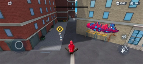 2. 运用摇杆进行操纵,屏幕左侧用于控制移动,右侧设置了攻击、发射蜘蛛丝、跳跃等键位。
