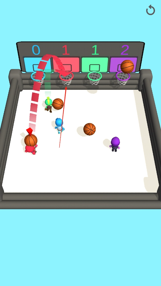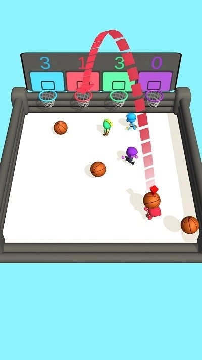 2、操控颜色小人移动,当捡到篮球后,便不能再移动,仅能调整投篮角度。要是篮球在空中发生碰撞,就会掉落地面,此时需重新争抢篮球。