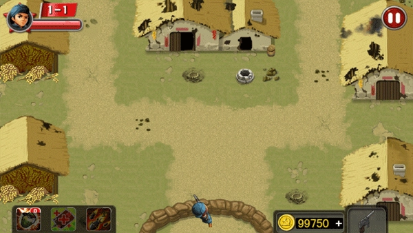 按照鬼子所在方向长按屏幕,便会触发连续的子弹攻击,右侧的枪图标可用于切换武器。