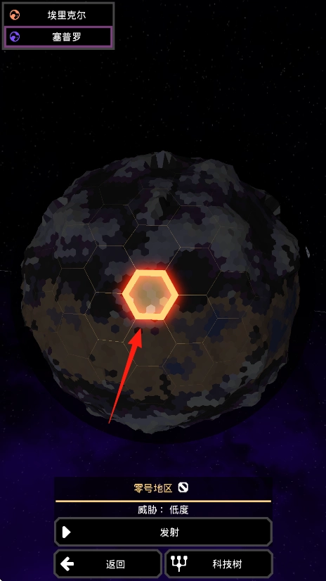 1. 把战役起点选定为塞普罗星球的红箭头,确认之后就会进入该星球的界面。在界面左上角切换至埃里克尔塞普罗,选择零号地区,该地区威胁程度为低度,最后点击发射。