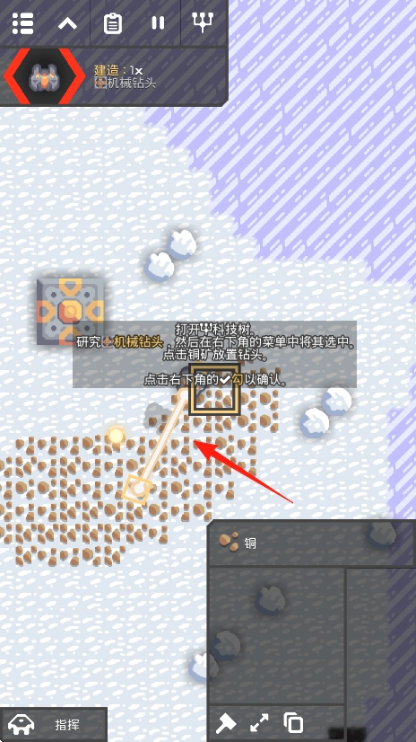 2. 抵达塞普罗星球区域后,依照提示对机械钻头展开研究,具体操作如下:选中机械钻头,点击铜矿并放置钻头,随后确认。此时会有红箭头指向铜矿,接着建造钻头,开始采集铜矿,以此积累资源。