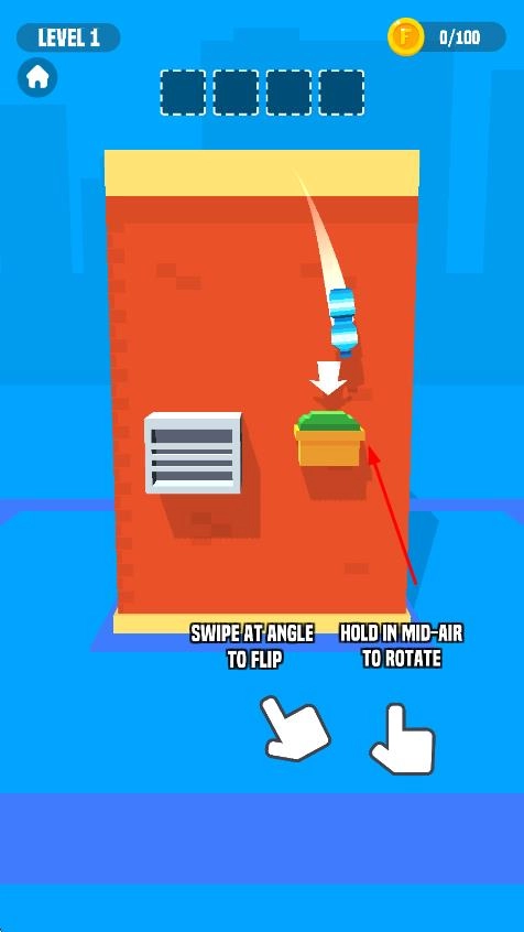 1. 进入游戏后,挑选初始关卡,留意瓶子位置以及目标落点,通过滑动屏幕来调节翻转的力度和角度,试着让瓶子安稳落地。