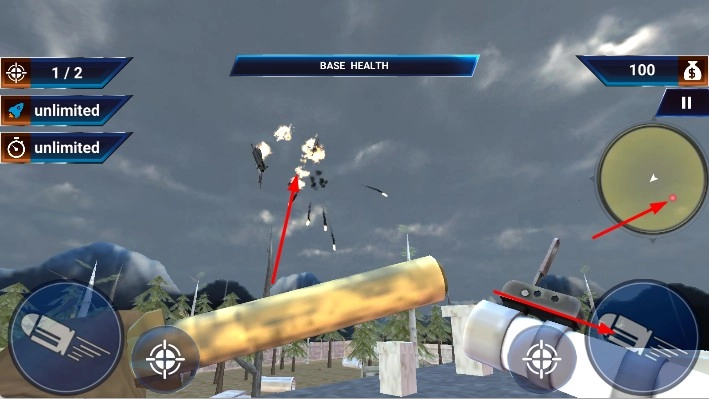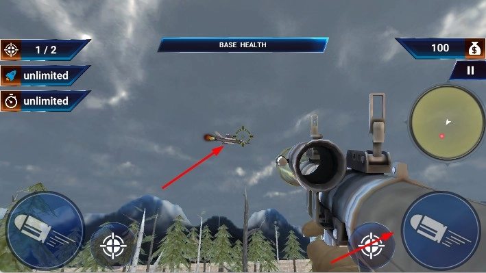 2、于游戏场景里,借助右侧的虚拟摇杆来操控战斗机的瞄准方向,点击对应的射击按钮,向空中的敌机展开射击。