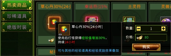 二、购买草心丹。草心丹能让你在24小时内,打怪获取的经验提升30%,并且该效果可与其他经验道具及经验奖励的效果叠加。
