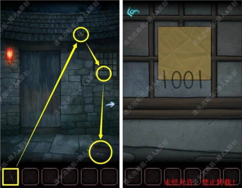 13. 在房间展开调查,获取将军骑马图以及签筒。参照刚得到的骑马图,完成左侧墙壁上的拼图,随后拉动开关。