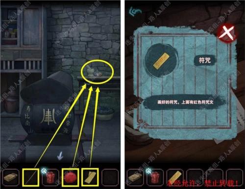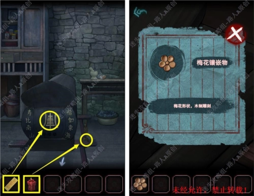 8.把道具【火柴】与【蜡烛】进行组合,接着将【点燃的蜡烛】放置在烛台上,再把【符咒】张贴到棺材上,随后打开棺材就能获取【梅花镶嵌物】。8.1