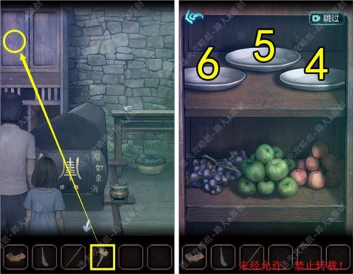 12. 拿【钥匙】开启柜子,依据窗户上的图案线索,在盘子里各自放置数量正确的水果。12.1、12.2