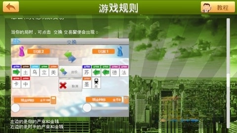 3、在游戏中,若想与其他玩家进行交易,可在自己的回合里,点击“交换”窗口来展开操作。该窗口左边展示的是你所拥有的产业,右边则是对手的产业。当完成交换操作后,双方角色需进行相应的交换。