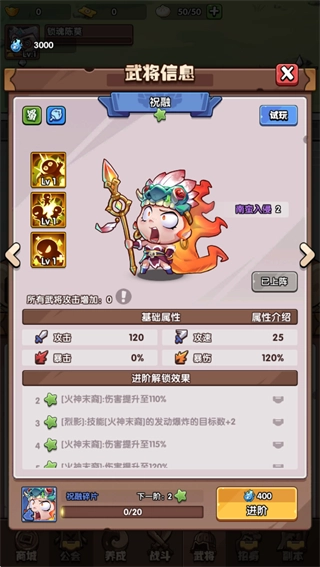 1、招揽来自不同阵营的武将,构建出拥有最强羁绊效果的阵容,充分挖掘武将们的潜能,让他们实现蜕变,提升星级,进阶为传说品阶的武将。