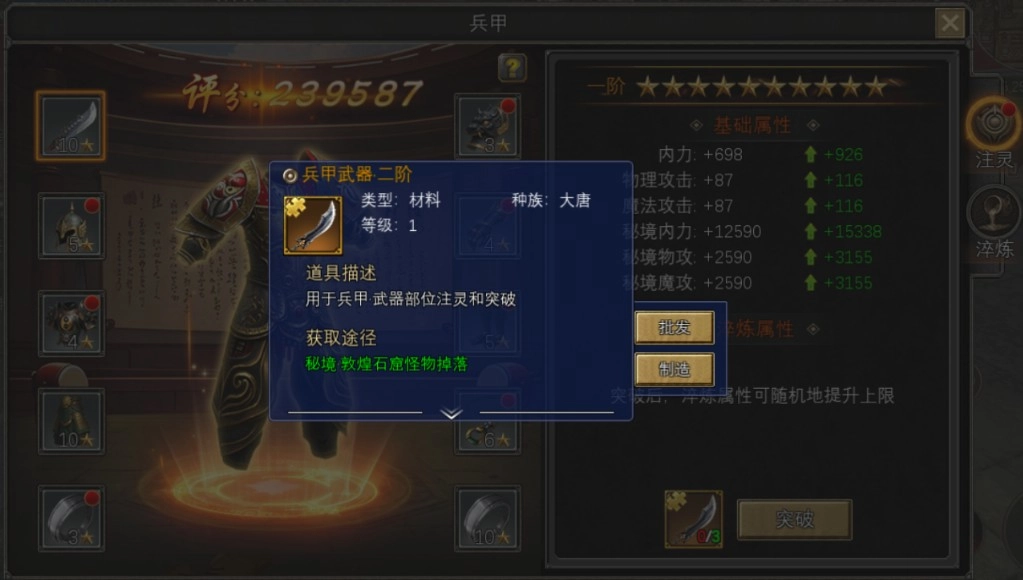 兵甲系统设有10个装备部位,每个部位皆可借助注灵来提升星级,星级从1星循序渐进,直至突破至10星。升星过程中,需消耗同阶本体当作材料。一旦某个部位成功升至10星满星状态,便可突破进入下一阶段,进而开启更为强大的属性成长空间。