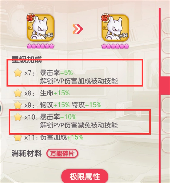 当然,并非所有精灵的星级加成中都包含暴击属性。例如,超梦的7星与10星加成所对应的就是暴击率。