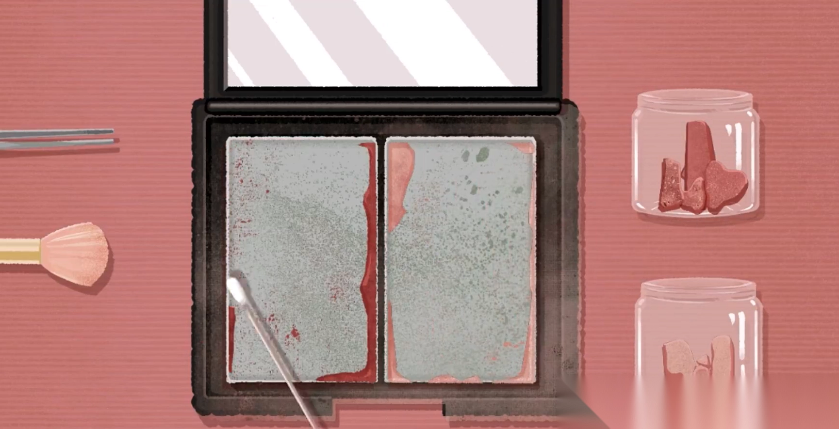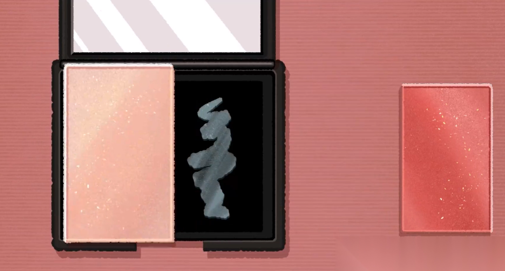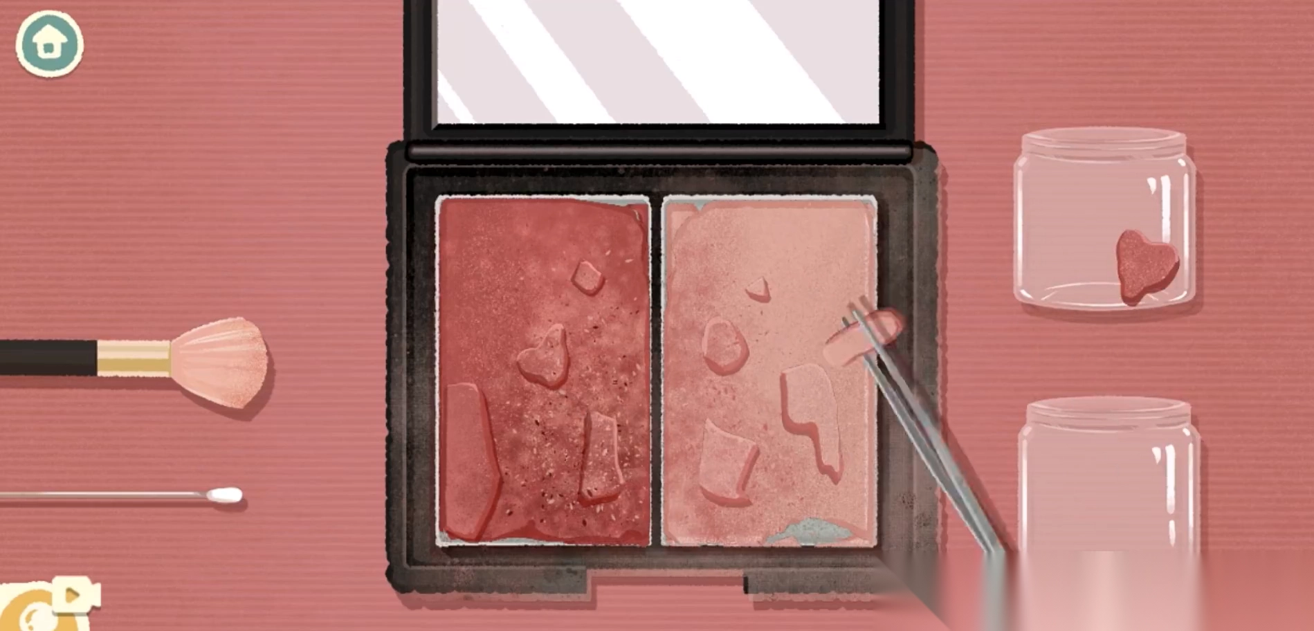 取出存放着凝结成块的新收集物的容器,通过打磨处理让其恢复细腻质地后,填回到腮红的原装盘中。