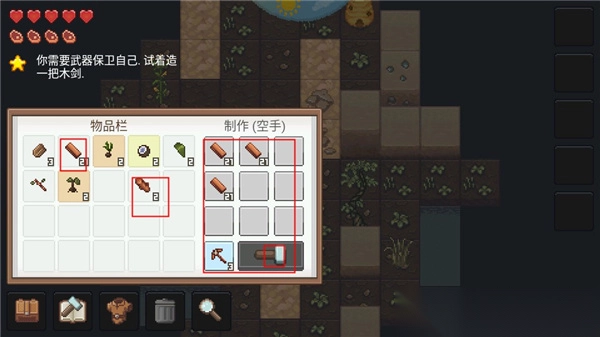把原木处理成可用的木材,树枝制成棍棒,这些加工好的材料需要从制作界面拖回背包存放,不然就会丢失。