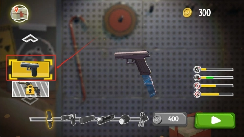 进入武器界面后,先查看当前拥有的金币数量为300,接着点击被黄色框标注的手枪图标,此时需要消耗400金币,即可完成该武器配件的解锁或升级操作。