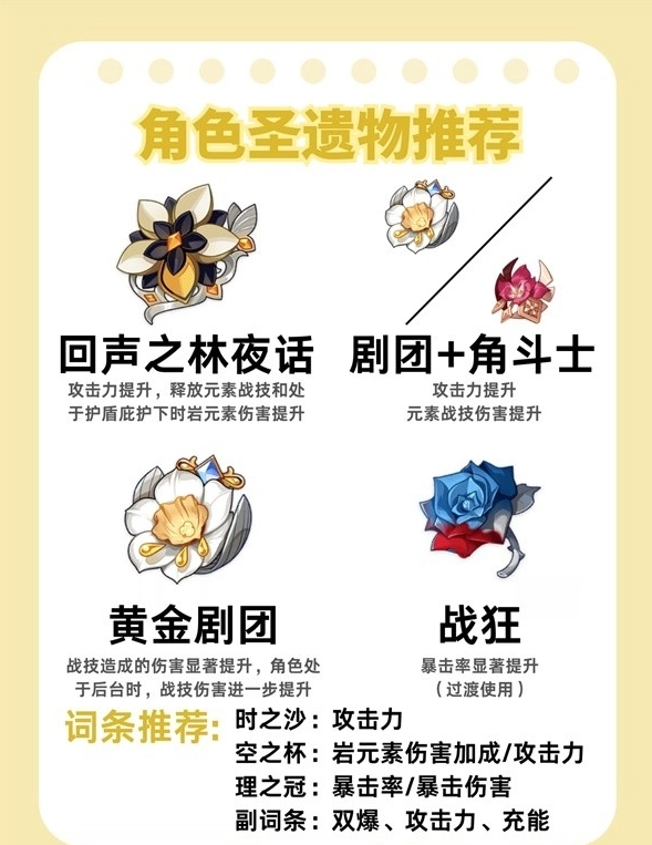 圣遗物的选择上,可考虑【回声之林夜话】(处于护盾庇护下时岩元素伤害提升)、【剧团与角斗士的组合】(攻击属性与战技伤害均有提升)、【黄金剧团】(为后台角色提供战技伤害加成);过渡阶段则可以使用【战狂】套装。