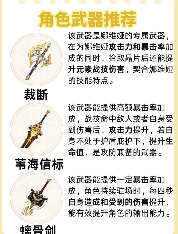 娜维娅的最佳武器选择是其专属装备裁断,这件武器能同时提升攻击力与暴击率,并且在角色拾取到晶片时,还会进一步增强战技的输出效果,各项属性加成与她的技能机制高度适配。
