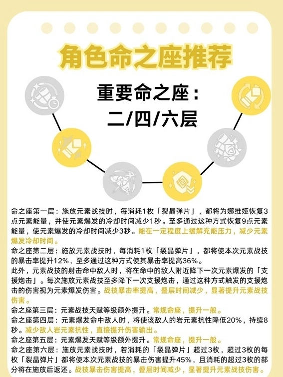 该角色的核心命座集中在第二、第四和第六层,这三层命座能显著强化其输出能力与核心机制;第一层命座可有效改善充能循环问题;第三、第五层命座则属于常规属性提升类,对整体强度有一定增益但并非决定性影响。