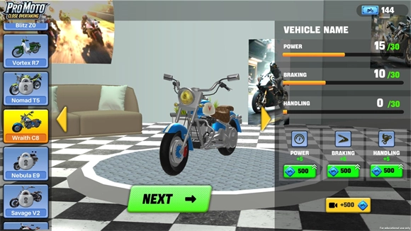 点击屏幕后可以选择不同的摩托车来驾驶。